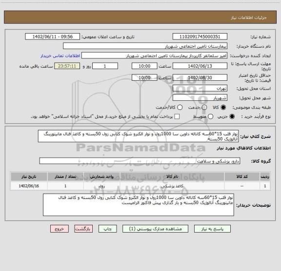 | 1 | -- | کاغذ پزشکی | رول | 1 | 1402/06/16 |