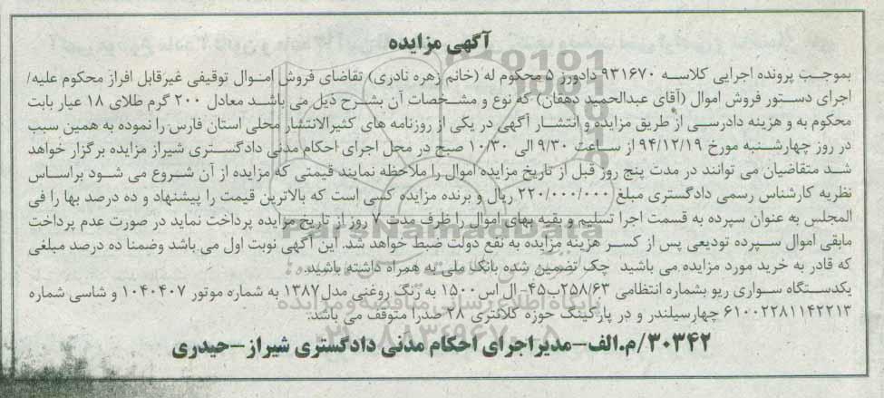 مزایده در روز چهارشنبه مورخ 94.12.19 از ساعت 9:30 الی 10:30 صبح در محل اجرای احکام مدنی دادگستری شیراز برگزار می گردد