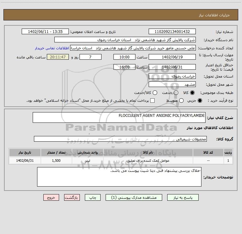 شرح کلی نیاز: FLOCCULENT AGENT ANIONIC POLYACRYLAMIDE