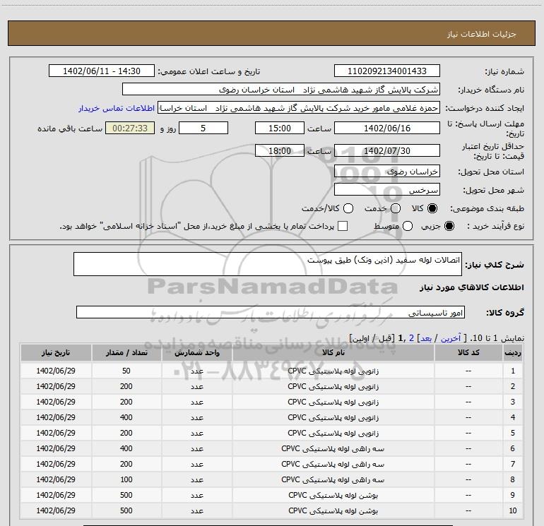 شرح کلی نیاز: اتصالات لوله سفید (اذین وتک) طیق پیوست