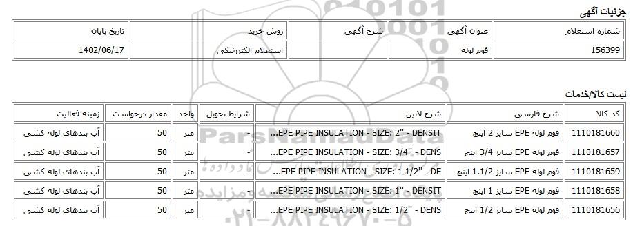 | 156399 | فوم لوله | استعلام الکترونیکی | 1402/06/17 |