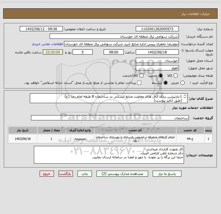 شرح کلی نیاز: 1-پارتیشن بندی اتاق های معاونت منابع انسانی در ساختمان 8 طبقه امام رضا (ع) (طبق آنالیز پیوست)