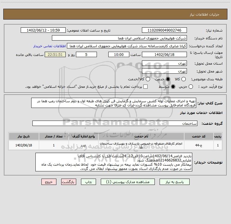 شرح کلی نیاز: تهیه و اجرای عملیات لوله کشی سرمایش و گرمایش فن کویل های طبقه اول و دوم ساختمان رمپ هما در فرودگاه امام-فایل پیوست مشاهده گردد-ایران کد صرفا جهت تشابه