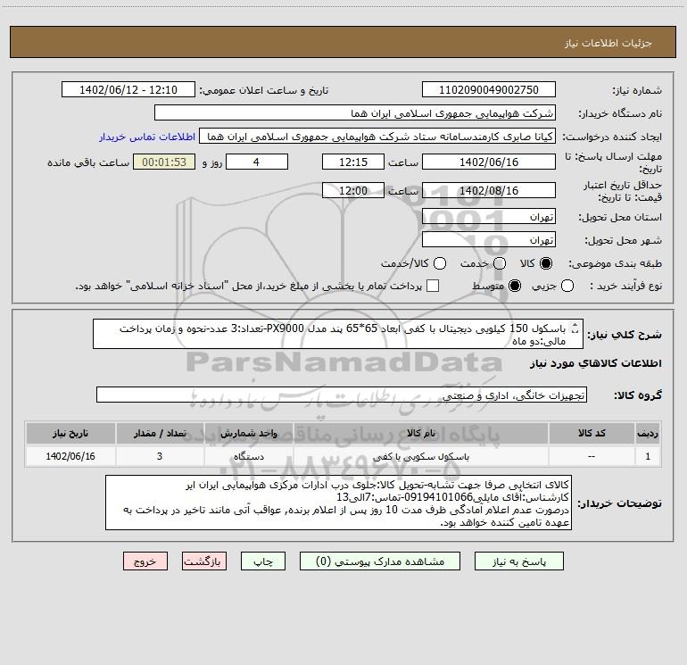 شرح کلی نیاز: باسکول 150 کیلویی دیجیتال با کفی ابعاد 65*65 پند مدل PX9000-تعداد:3 عدد-نحوه و زمان پرداخت مالی:دو ماه