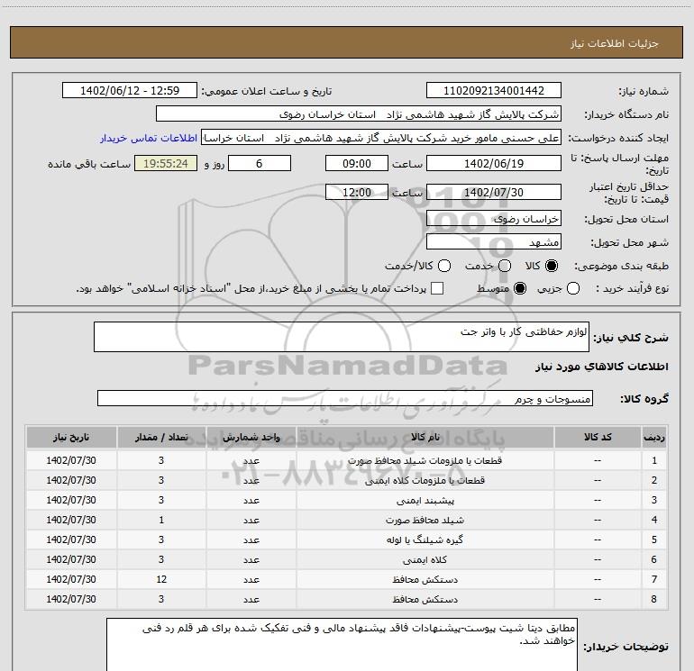 نام دستگاه خریدار:شرکت پالایش گاز شهید هاشمی نژاد استان خراسان رضوی