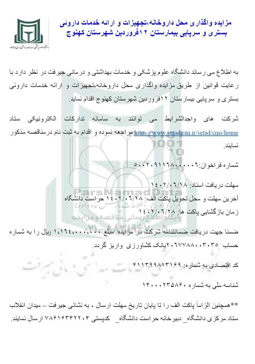 مزایده واگذاری محل داروخانه تجهیزات و ارائه خدمات داروئی بستری و سرپایی بیمارستان 12 فروردین شهرستان کهنوج