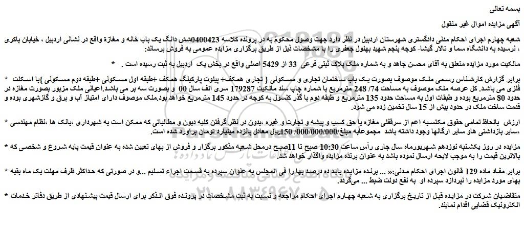 شعبه چهارم اجرای احکام مدنی دادگستری شهرستان اردبیل در نظر دارد جهت وصول محکومٌ به در پرونده کلاسه 0400423شش دانگ یک باب خانه و مغازة واقع در نشانی اردبیل ، خیابان باکری ، نرسیده به دانشگاه سما و تالار گیشا- کوچه پنجم شهید بهلول جعفری را با مشخصات ذیل از طریق برگزاری مزایده عمومی به فروش برساند: