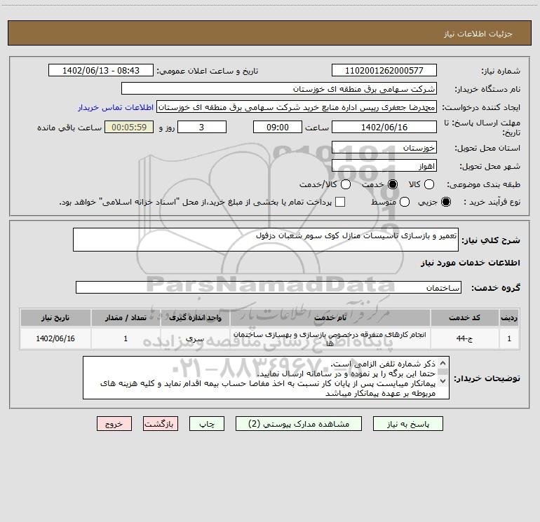 استعلام تعمیر و بازسازی تاسیسات منازل کوی سوم شعبان دزفول, استعلام تعمیر و بازسازی تاسیسات منازل کوی سوم شعبان دزفول