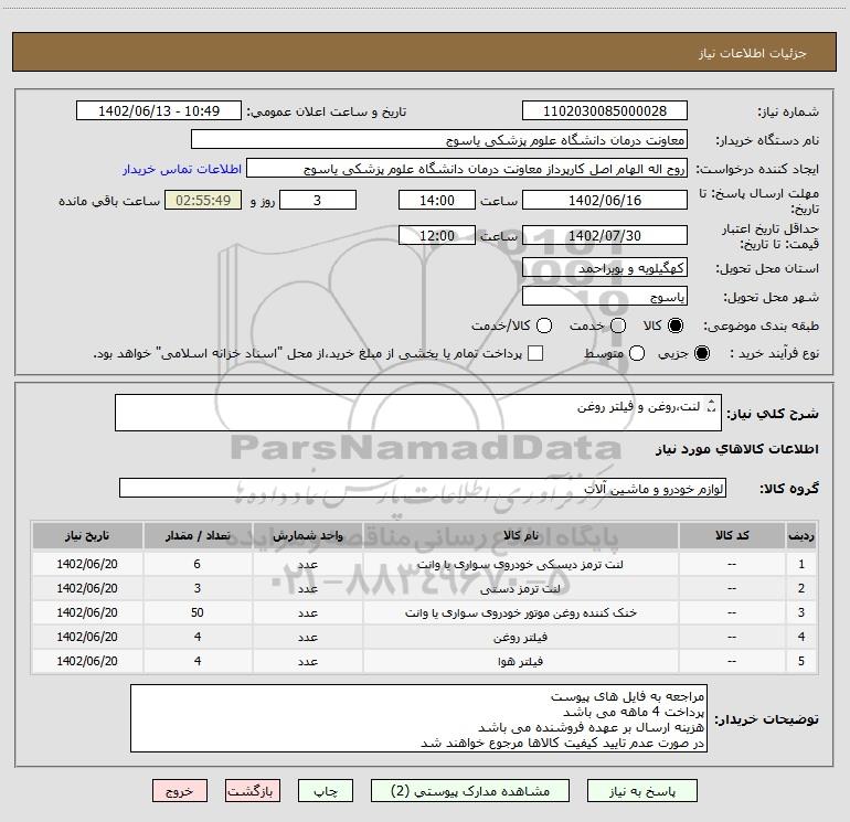 شرح کلی نیاز: لنت،روغن و فیلتر روغن