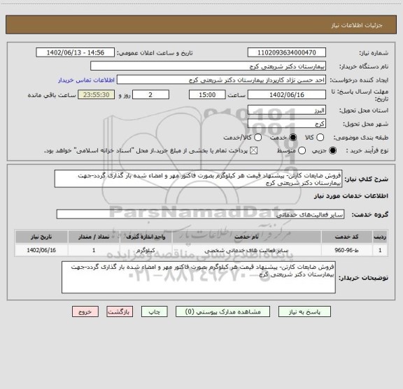 شرح کلی نیاز: فروش ضایعات کارتن- پیشنهاد قیمت هر کیلوگرم بصورت فاکتور مهر و امضاء شده بار گذاری گردد-جهت بیمارستان دکتر شریعتی کرج