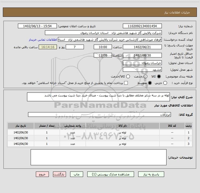نام دستگاه خریدار:شرکت پالایش گاز شهید هاشمی نژاد استان خراسان رضوی