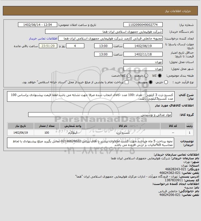 | 1 | -- | کنسرو ذرت | کیلوگرم | 100 | 1402/06/19 |