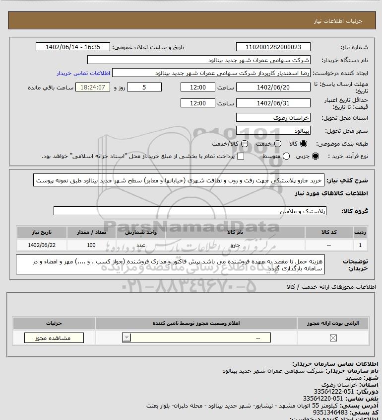شرح کلی نیاز: خرید جارو پلاستیکی جهت رفت و روب و نظافت شهری (خیابانها و معابر) سطح شهر جدید بینالود طبق نمونه پیوست