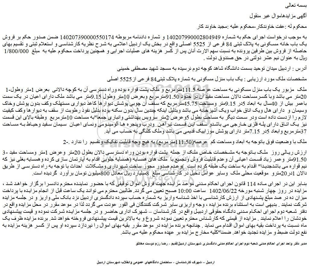 به موجب درخواست اجرای حکم به شماره 140207990002804949 و شماره دادنامه مربوطه 140207390000550174 ضمن صدور حکم بر فروش یک باب خانه مسکونی به پلاک ثبتی 84 فرعی از 5525 اصلی واقع در بخش یک اردبیل اعلامی به شرح نظریه کارشناسی و استعلام ثبتی و تقسیم بهای حاصله از فروش بین طرفین پرونده به نسبت سهم الارث آنان پس از کسر هزینه های عملیات اجرایی و همچنین پرداخت محکوم علیه به مبلغ 1/800/000 ریال به عنوان نیم عشر دولتی در حق صندوق دولت .
