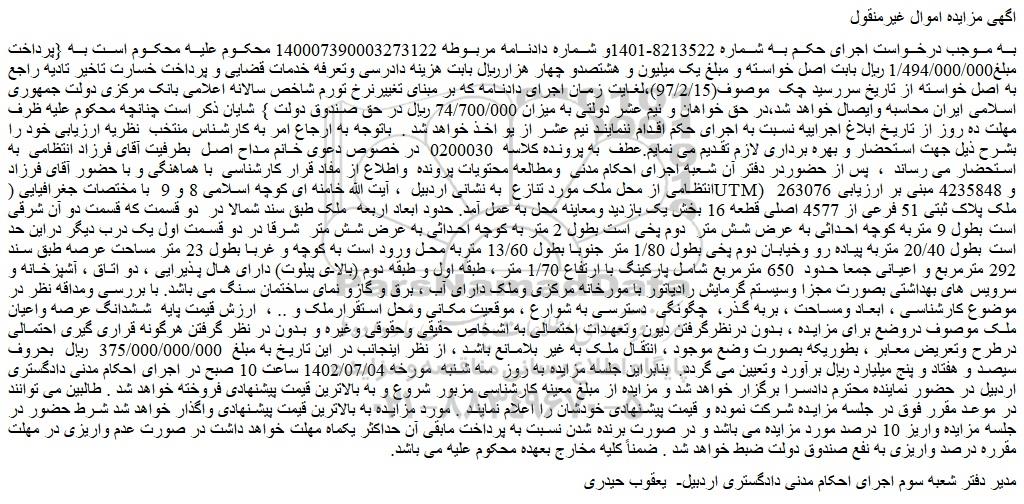 شعبه صادر کننده:شعبه سوم اجرای احکام مدنی دادگستری شهرستان اردبیل