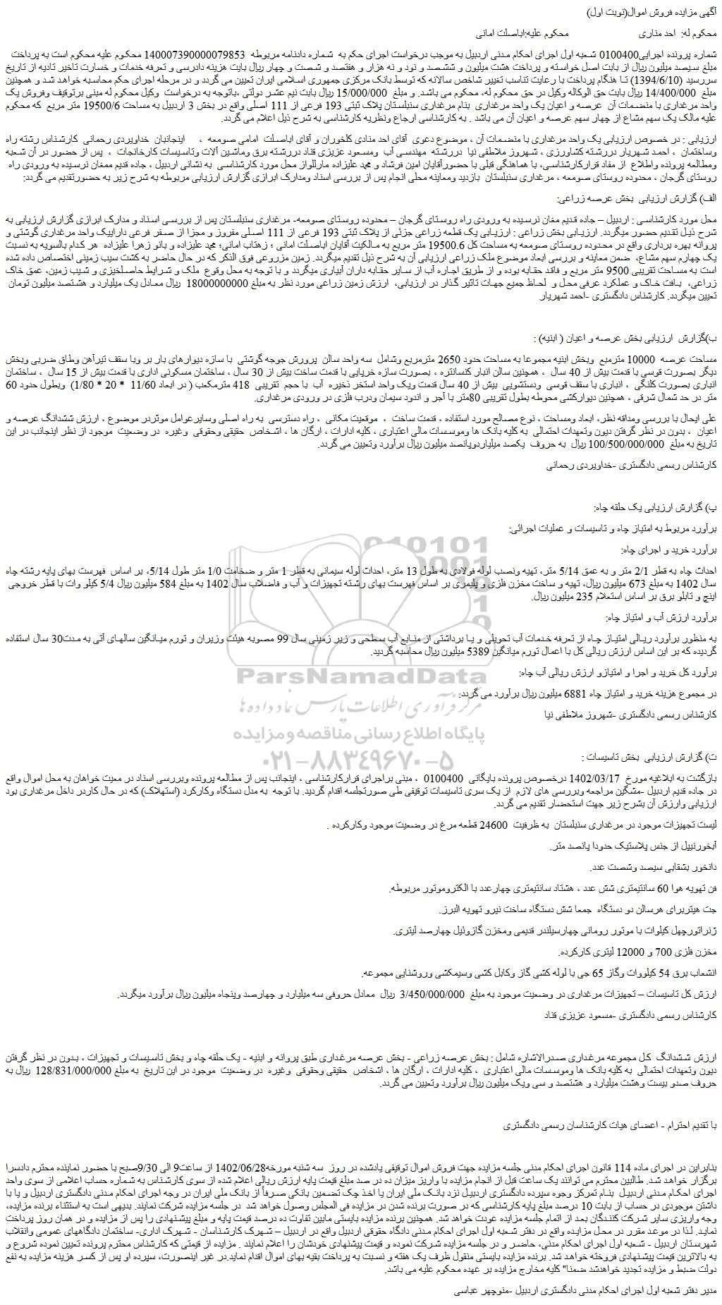 شماره پرونده اجرایی0100400 شعبه اول اجرای احکام مدنی اردبیل به موجب درخواست اجرای حکم به شماره دادنامه مربوطه 140007390000079853 محکوم علیه محکوم است به پرداخت مبلغ سیصد میلیون ریال از بابت اصل خواسته و پرداخت هشت میلیون و ششصد و نود و نه هزار و هفتصد و شصت و چهار ریال بایت هزینه دادرسی و تعرفه خدمات و خسارت تاخیر تادیه از تاریخ سررسید (1394/6/10) تا هنگام پرداخت با رعایت تناسب تغییر شاخص سالانه که توسط بانک مرکزی جمهوری اسلامی ایران تعیین می گردد و در مرحله اجرای حکم محاسبه خواهد شد و همچنین مبلغ 14/400/000 ریال بابت حق الوکاله وکیل در حق محکوم له، محکوم می باشد. و مبلغ 15/000/000 ریال بابت نیم عشر دولتی ،باتوجه به درخواست وکیل محکوم له مبنی برتوقیف وفروش یک واحد مرغداری با منضمات آن عرصه و اعیان یک واحد مرغداری بنام مرغداری سنبلستان پلاک ثبتی 193 فرعی از 111 اصلی واقع در بخش 3 اردبیل به مساحت 19500/6 متر مربع که محکوم علیه مالک یک سهم مشاع از چهار سهم عرصه و اعیان آن می باشد . به کارشناسی ارجاع ونظریه کارشناسی به شرح ذیل اعلام می گردد.