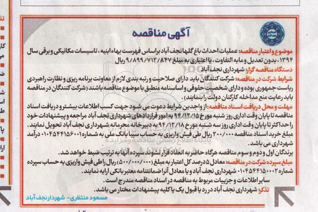 مهلت و محل دریافت اسناد مناقصه : از واجدین شرایط دعوت می شود جهت کسب اطلاعات بیشتر و دریافت اسناد مناقصه تا پایان وقت اداری روز شنبه مورخ 94.12.15 به امور قراردادهای شهرداری نجف آباد مراجعه و پیشنهادات خود را حداکثر تاپایان وقت اداری روز سه شنبه مورخ 94.12.18 به دبیرخانه محرمانه شهرداری نجف آباد تحویل نمایند.