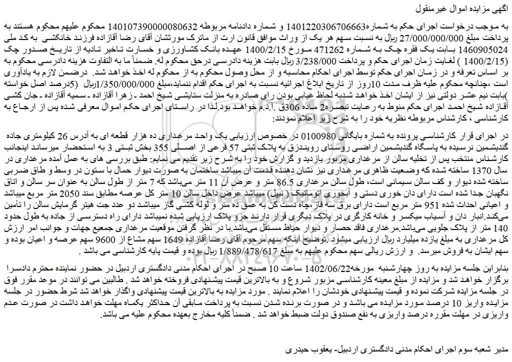 به موجب درخواست اجرای حکم به شماره1401220306706663 و شماره دادنامه مربوطه 140107390000080632 محکوم علیهم محکوم هستند به پرداخت مبلغ 27/000/000/000 ریال به نسبت سهم هر یک از وراث موافق قانون ارث از ماترک مورثشان آقای رضا آقازاده فرزند خانکشی به کد ملی 1460905024 بابت یک فقره چک به شماره 471262 مورخ 1400/2/15 عهده بانک کشاورزی و خسارت تاخیر تادیه از تاریخ صدور چک (1400/2/15 ) لغایت زمان اجرای حکم و پرداخت 3/238/000 ریال بابت هزینه دادرسی درحق محکوم له. ضمناً ما به التفاوت هزینه دادرسی محکوم به بر اساس تعرفه و در زمان اجرای حکم توسط اجرای احکام محاسبه و از محل وصول محکوم به از محکوم له اخذ خواهد شد. درضمن لازم به یادآوری است ،چنانچه محکوم علیه ظرف مدت 10روز از تاریخ ابلاغ اجرائیه نسبت به اجرای حکم اقدام ننماید،مبلغ 1/350/000/000ریال (5درصد اصل خواسته )بابت نیم عشر دولتی نیز از ایشان اخذ خواهد شدبه لحاظ غیابی بودن رای صادره به منزلت ستایشی شیخ احمد ـ زهرا آقازاده ـ سمیه آقازاده ـ جان کشی آقازاده شیخ احمد اجرای حکم منوط به رعایت تبصره2 ماده 306ق .آ.د.م خواهد بود.لذا در راستای اجرای حکم اموال معرفی شده پس از ارجاع به کارشناسی ، کارشناس مربوطه نظریه خود را به شرح زیر اعلام نمودند: