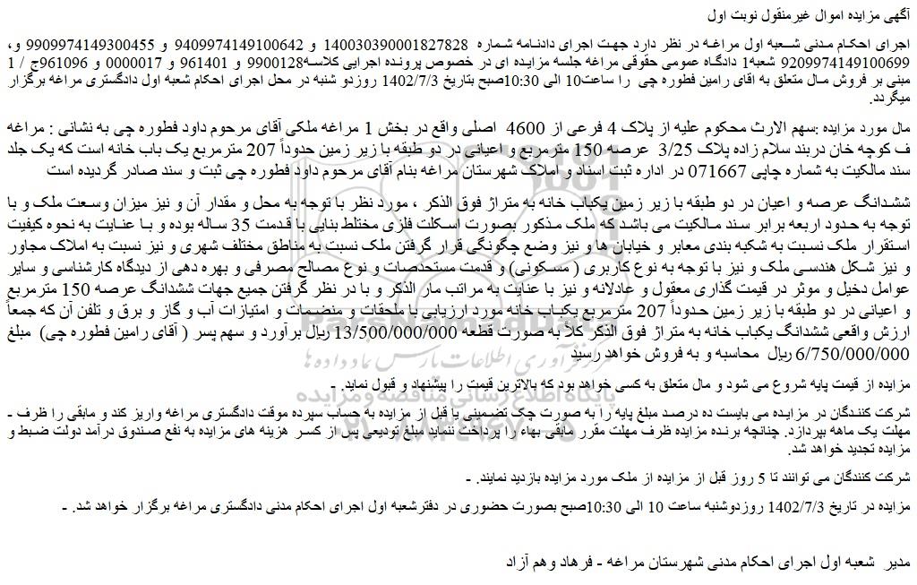 - مزایده در تاریخ 1402/7/3 روزدوشنبه ساعت 10 الی 10:30صبح بصورت حضوری در دفترشعبه اول اجرای احکام مدنی دادگستری مراغه برگزار خواهد شد.