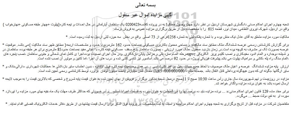 شعبه چهارم اجرای احکام مدنی دادگستری شهرستان اردبیل در نظر دارد جهت وصول محکومٌ به در پرونده کلاسه0200423 یک ساختمان آپارتمانی در حال احداث و نیمه کاره{پیلوت +چهار طبقه مسکونی +بهارخواب } واقع در اردبیل، شهرک نیروی انتظامی، میدان نور، قطعه 615 را با مشخصات ذیل از طریق برگزاری مزایده عمومی به فروش برساند: