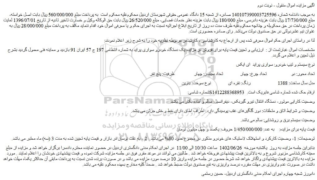 بنابراین جلسه مزایده به روز یکشنبه مورخه 1402/06/26 ساعت 10/30 الی 11/00 در اجرای احکام مدنی دادگستری اردبیل در حضور نماینده محترم دادسرا برگزار خواهد شد و مزایده از مبلغ معینه کارشناسی مزبور شروع و به بالاترین قیمت پیشنهادی فروخته خواهد شد . طالبین می توانند در موعد مقرر فوق در جلسه مزایده شرکت نموده و قیمت پیشنهادی خودشان را اعلام نمایند . مورد مزایده به بالاترین قیمت پیشنهادی واگذار خواهد شد شرط حضور در جلسه مزایده واریز 10 درصد مورد مزایده می باشد و در صورت برنده شدن نسبت به پرداخت مابقی آن حداکثر یکماه مهلت خواهد داشت در صورت عدم واریزی در مهلت مقرره درصد واریزی به نفع صندوق دولت ضبط خواهد شد . ضمناً کلیه مخارج بعهده محکوم علیه می باشد.