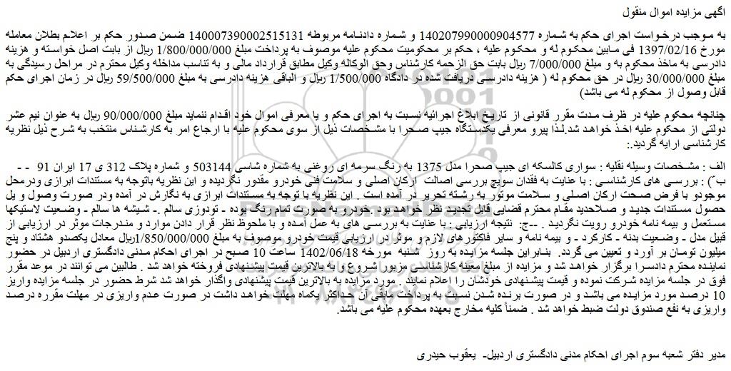 الف : مشخصات وسیله نقلیه : سواری کالسکه ای جیپ صحرا مدل 1375 به رنگ سرمه ای روغنی به شماره شاسی 503144 و شماره پلاک 312 ی 17 ایران 91 - -ب ّ) : بررسی های کارشناسی : با عنایت به فقدان سویچ بررسی اصالت ارکان اصلی و سلامت فنی خودرو مقدور نگردیده و این نظریه باتوجه به مستندات ابرازی ودرمحل موجودو با فرض صحت ارکان اصلی و سلامت موتور به رشته تحریر در آمده است . این نظریه با توجه به مستندات ابرازی به نگارش در آمده ودر صورت وصول و یل حصول مستندات جدید و صلاحدید مقام محترم قضایی قابل تجدید نظر خواهد بود .خودرو به صورت تمام رنگ بوده - تودوزی سالم .- شیشه ها سالم - وضعیت لاستیکها مستعمل و بیمه نامه خودرو رویت نگردید . --ج: نتیجه ارزیابی : با عنایت به بررسی های به عمل آمده و با ملحوظ نظر قرار دادن موارد و مندرجات موثر در ارزیابی از قبیل مدل - وضعیت بدنه - کارکرد - و بیمه نامه و سایر فاکتورهای لازم و موثر در ارزیابی قیمت خودرو موصوف به مبلغ 1/850/000/000ریال معادل یکصدو هشتاد و پنج میلیون تومان بر آورد و تعیین می گردد. بنابراین جلسه مزایده به روز شنبه مورخه 1402/06/18 ساعت 10 صبح در اجرای احکام مدنی دادگستری اردبیل در حضور نماینده محترم دادسرا برگزار خواهد شد و مزایده از مبلغ معینه کارشناسی مزبور شروع و به بالاترین قیمت پیشنهادی فروخته خواهد شد . طالبین می توانند در موعد مقرر فوق در جلسه مزایده شرکت نموده و قیمت پیشنهادی خودشان را اعلام نمایند . مورد مزایده به بالاترین قیمت پیشنهادی واگذار خواهد شد شرط حضور در جلسه مزایده واریز 10 درصد مورد مزایده می باشد و در صورت برنده شدن نسبت به پرداخت مابقی آن حداکثر یکماه مهلت خواهد داشت در صورت عدم واریزی در مهلت مقرره درصد واریزی به نفع صندوق دولت ضبط خواهد شد . ضمناً کلیه مخارج بعهده محکوم علیه می باشد.