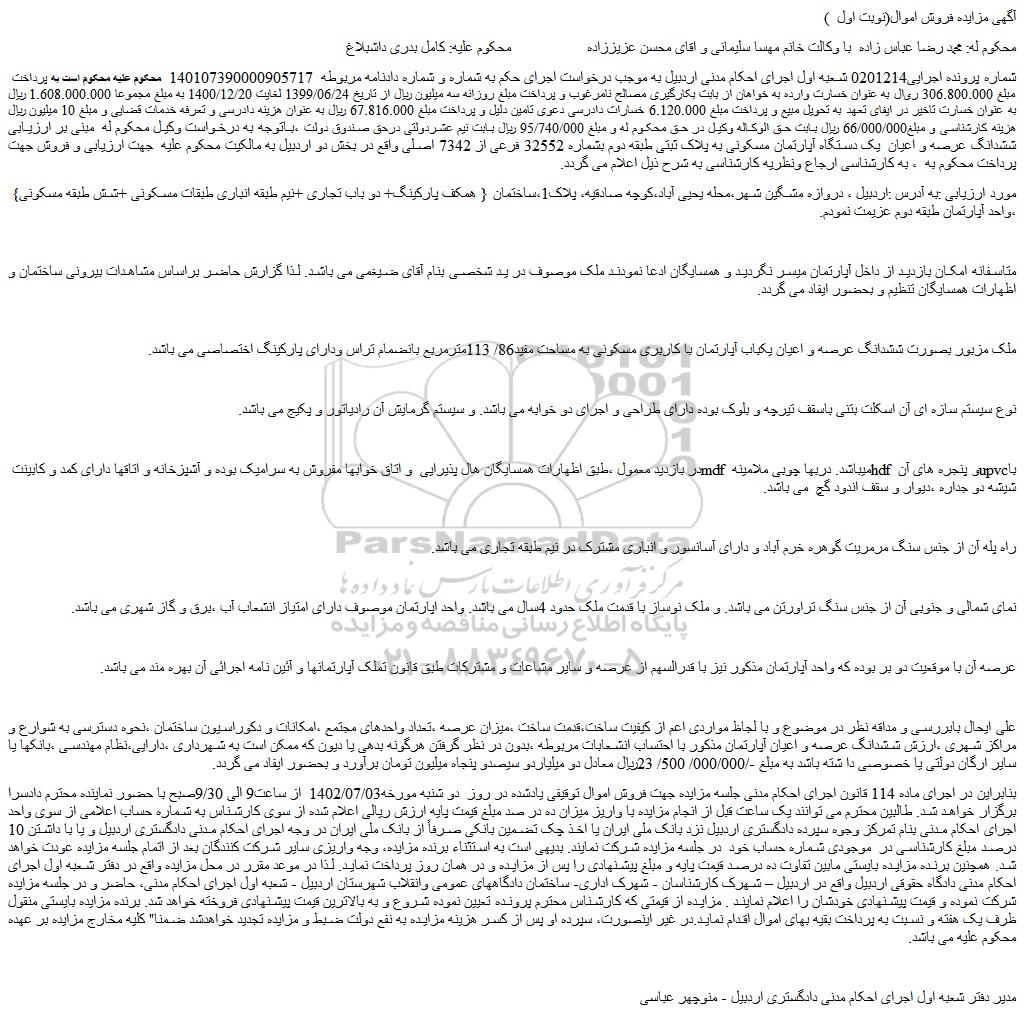 شماره پرونده اجرایی0201214 شعبه اول اجرای احکام مدنی اردبیل به موجب درخواست اجرای حکم به شماره و شماره دادنامه مربوطه 140107390000905717 محکوم علیه محکوم است به پرداخت مبلغ 306.800.000 ریال به عنوان خسارت وارده به خواهان از بابت بکارگیری مصالح نامرغوب و پرداخت مبلغ روزانه سه میلیون ریال از تاریخ 1399/06/24 لغایت 1400/12/20 به مبلغ مجموعا 1.608.000.000 ریال به عنوان خسارت تاخیر در ایفای تعهد به تحویل مبیع و پرداخت مبلغ 6.120.000 خسارات دادرسی دعوی تامین دلیل و پرداخت مبلغ 67.816.000 ریال به عنوان هزینه دادرسی و تعرفه خدمات قضایی و مبلغ 10 میلیون ریال هزینه کارشناسی و مبلغ66/000/000 ریال بابت حق الوکاله وکیل در حق محکوم له و مبلغ 95/740/000 ریال بابت نیم عشردولتی درحق صندوق دولت ،باتوجه به درخواست وکیل محکوم له مبنی بر ارزیابی ششدانگ عرصه و اعیان یک دستگاه آپارتمان مسکونی به پلاک ثبتی طبقه دوم بشماره 32552 فرعی از 7342 اصلی واقع در بخش دو اردبیل به مالکیت محکوم علیه جهت ارزیابی و فروش جهت پرداخت محکوم به ، به کارشناسی ارجاع ونظریه کارشناسی به شرح ذیل اعلام می گردد.