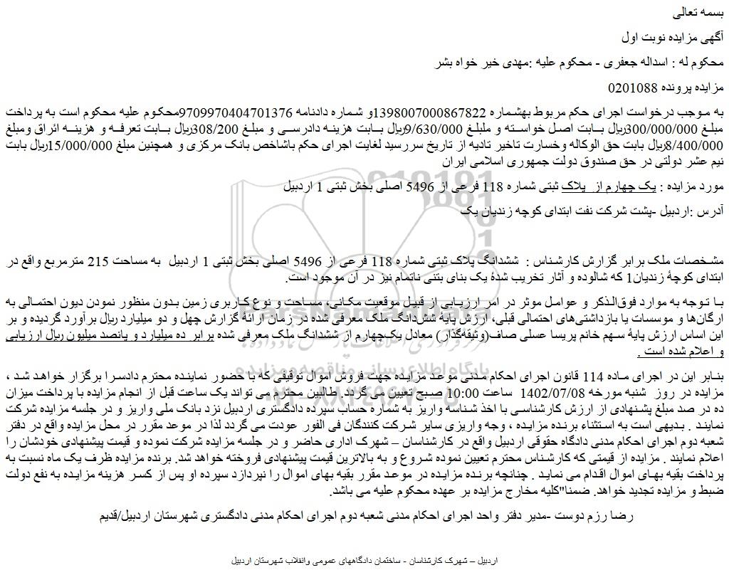 مورد مزایده : یک چهارم از پلاک ثبتی شماره 118 فرعی از 5496 اصلی بخش ثبتی 1 اردبیل