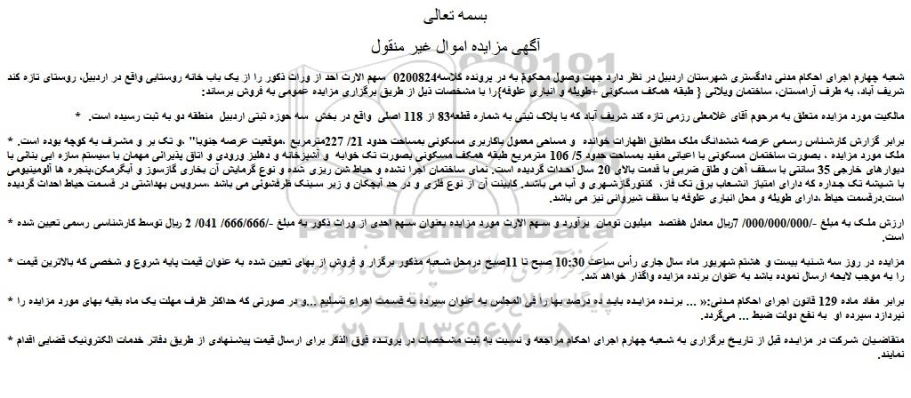 شعبه چهارم اجرای احکام مدنی دادگستری شهرستان اردبیل در نظر دارد جهت وصول محکومٌ به در پرونده کلاسه0200824 سهم الارث احد از وراث ذکور را از یک باب خانه روستایی واقع در اردبیل، روستای تازه کند شریف آباد، به طرف آرامستان، ساختمان ویلائی { طبقه همکف مسکونی +طویله و انباری علوفه}را با مشخصات ذیل از طریق برگزاری مزایده عمومی به فروش برساند: