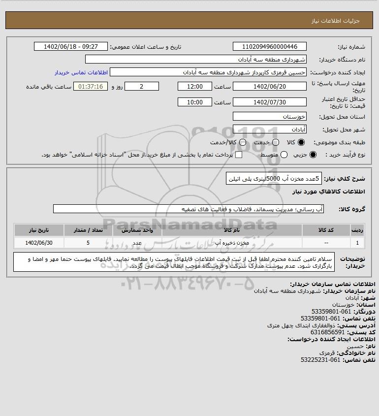 استعلام 5عدد مخزن آب 5000لیتری پلی اتیلن, استعلام 5عدد مخزن آب 5000لیتری پلی اتیلن