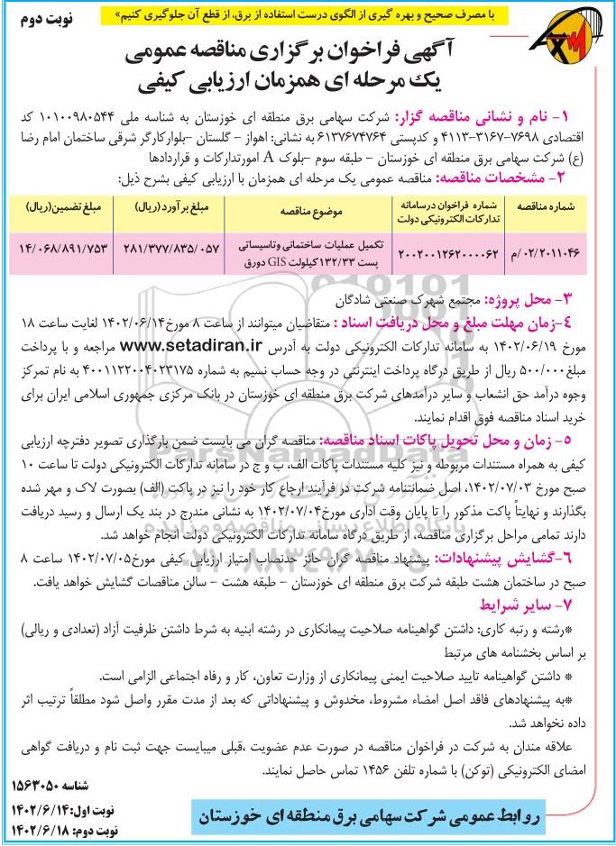 | 02/2011046/م | 2002001262000062 | تکمیل عملیات ساختمانی و تاسیساتی پست 132.33 کیلوولت GIS دورق | 281.377.835.057 | 14.068.891.753 |