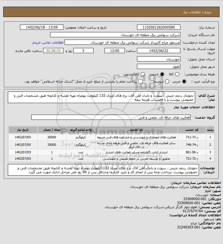 شرح کلی نیاز: دمونتاژ، ردیف چینی ، سورت و باندل آهن آلات برج های آویری 132 کیلوولت بهمراه تهیه نقشه و کتابچه طبق مشخصات فنی و خصوصی پیوست و با احتساب هزینه بیمه