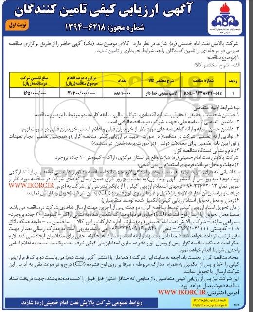 ارزیابی کیفی لامپ مهتابی خط دار, آگهی ارزیابی کیفی تامین کنندگان, ارزیابی کیفی لامپ مهتابی خط دار