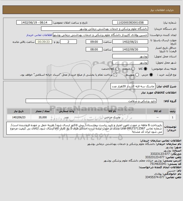 | 1 | -- | ماسک جراحی | عدد | 20,000 | 1402/06/23 |