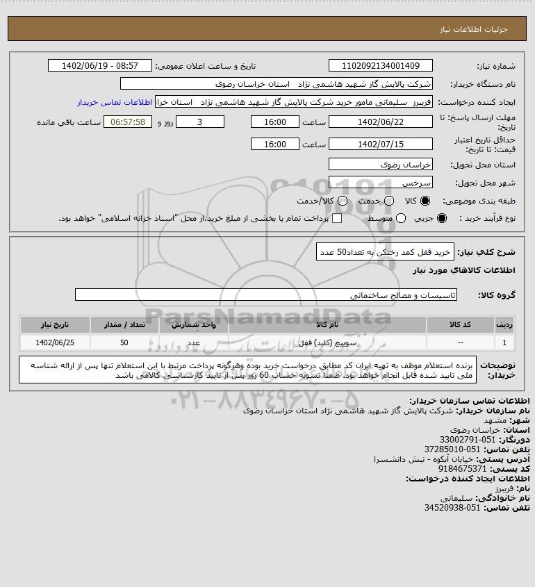 نام دستگاه خریدار:شرکت پالایش گاز شهید هاشمی نژاد استان خراسان رضوی