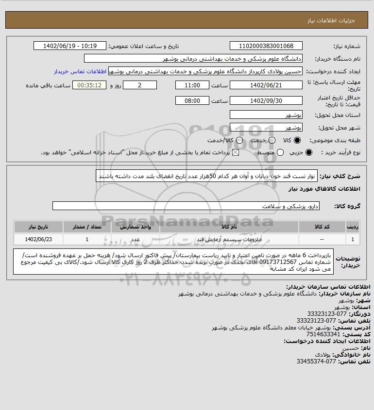 شرح کلی نیاز: نوار تست قند خون دیابان و آوان هر کدام 50هزار عدد تاریخ انقضای بلند مدت داشته باشند