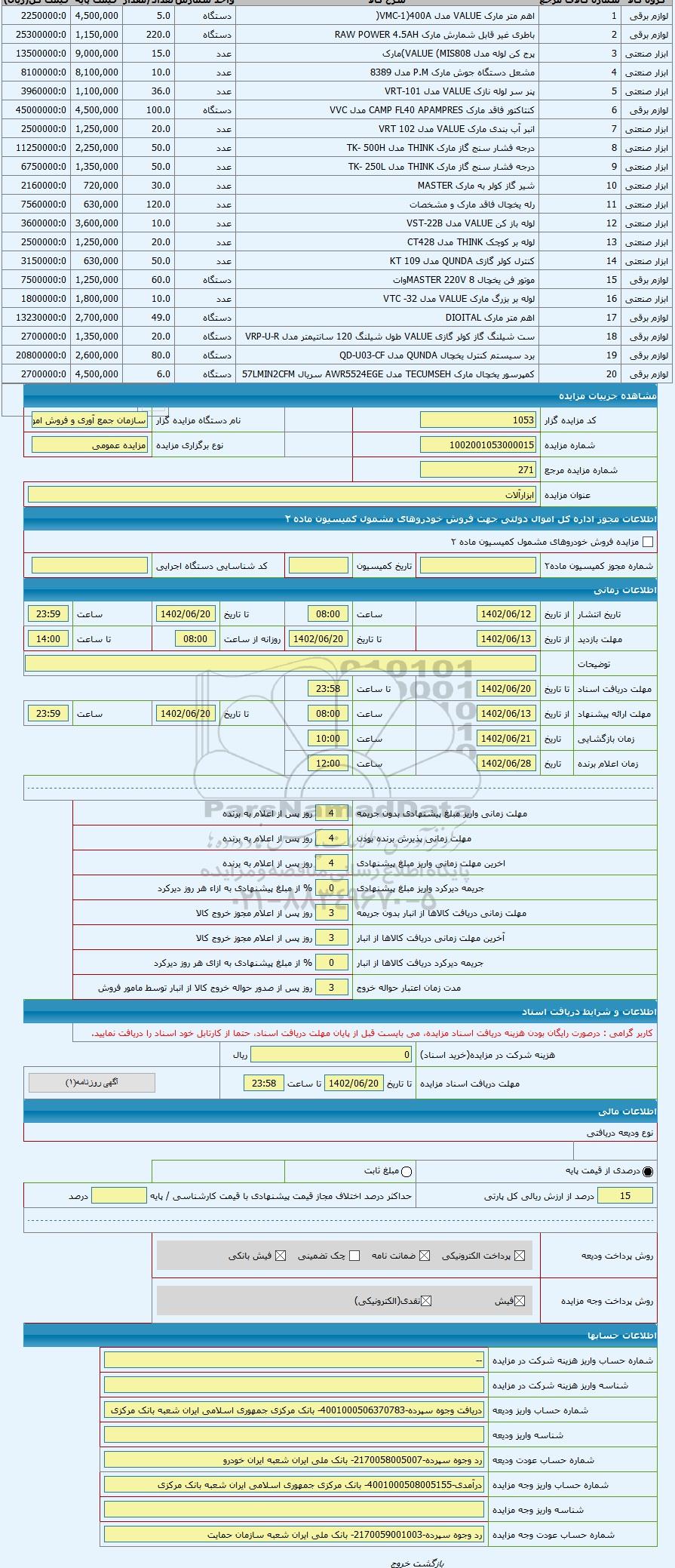 | کد مزایده گزار | 1053 | نام دستگاه مزایده گزار | سازمان جمع آوری و فروش اموال تملیکی | |