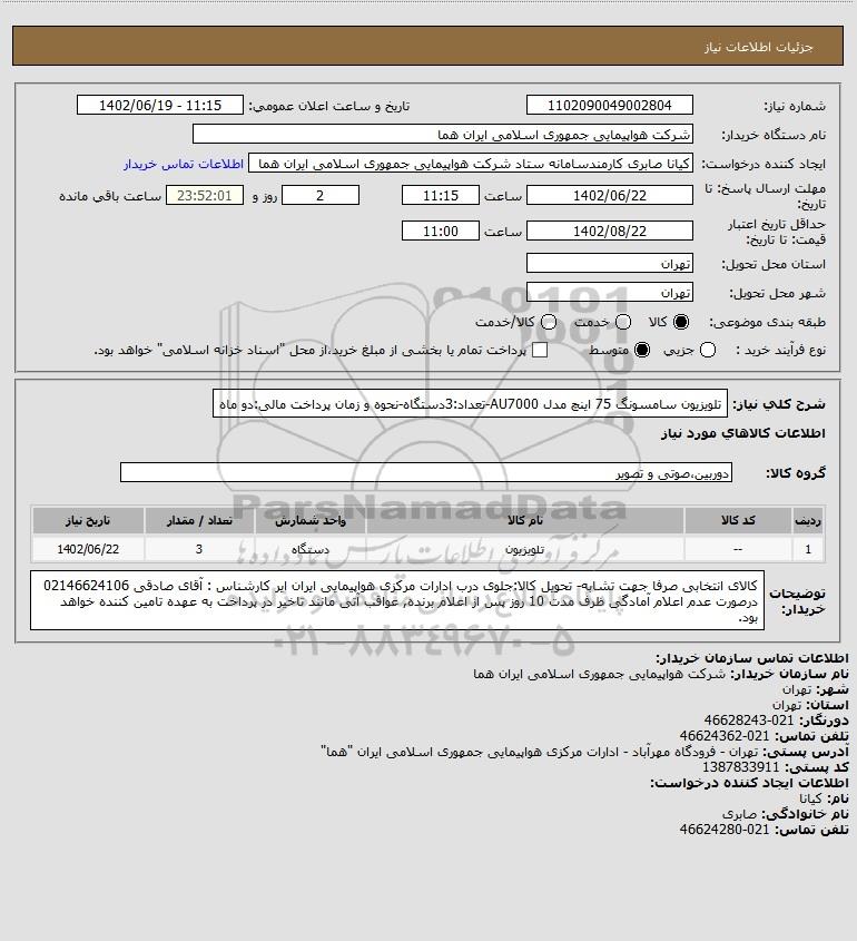 استعلام تلویزیون سامسونگ 75 اینچ مدل AU7000-تعداد:3دستگاه-نحوه و زمان پرداخت مالی:دو ماه, استعلام تلویزیون سامسونگ 75 اینچ مدل AU7000-تعداد:3دستگاه-نحوه و زمان پرداخت مالی:دو ماه