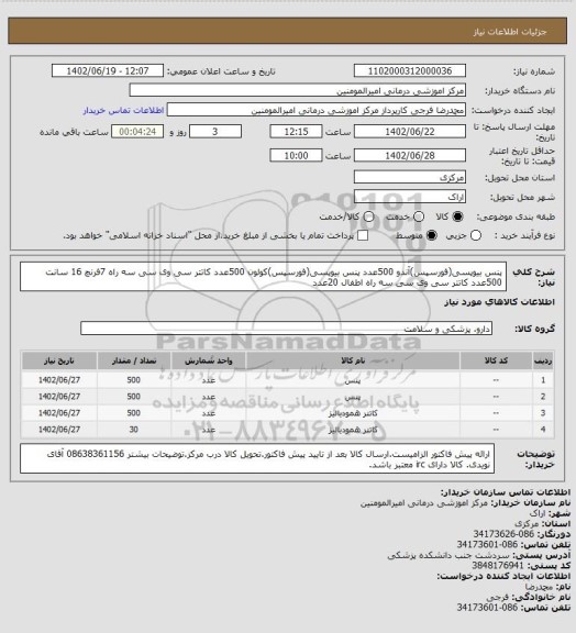 | 3 | -- | کاتتر همودیالیز | عدد | 500 | 1402/06/27 |