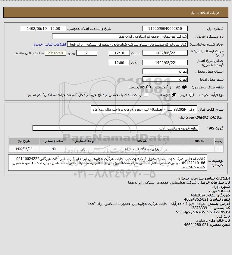استعلام روغن B320SH بیتزر - تعداد:40 لیتر -نحوه و زمان پرداخت مالی:دو ماه, استعلام روغن B320SH بیتزر - تعداد:40 لیتر -نحوه و زمان پرداخت مالی:دو ماه