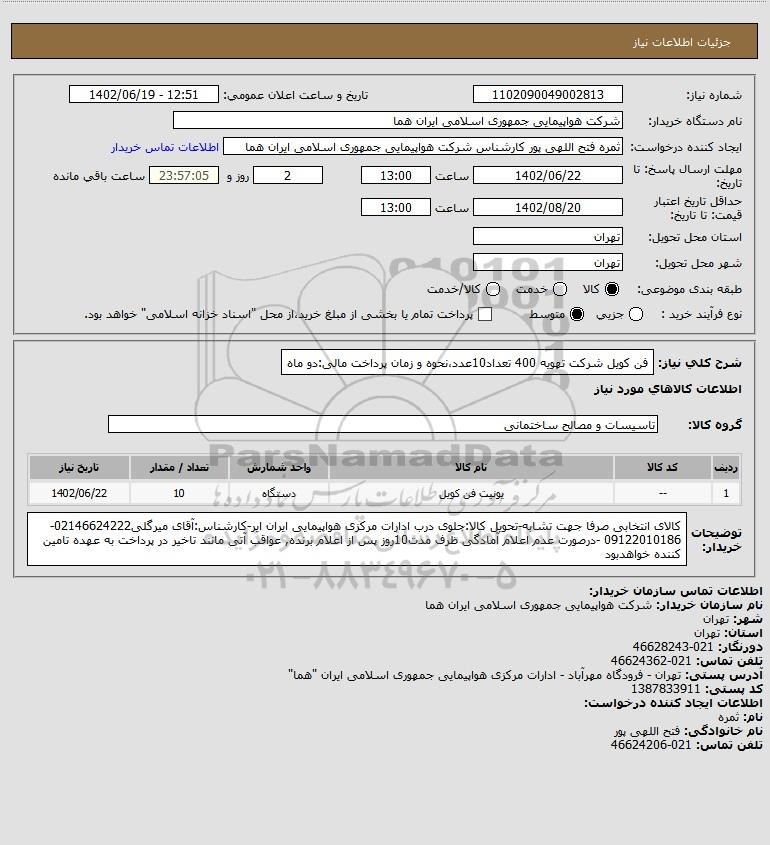 شرح کلی نیاز: فن کویل شرکت تهویه 400 تعداد10عدد،نحوه و زمان پرداخت مالی:دو ماه