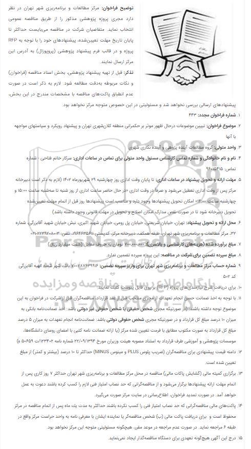 توضیح فراخوان: مركز مطالعات و برنامهریزی شهر تهران در نظر دارد مجری پروژه پژوهشی مذكور را از طریق مناقصه عمومی انتخاب نماید. متقاضیان شركت در مناقصه میبایست حداكثر تا پایان تاریخ مهلت تعیینشده، پیشنهادهای خود را با توجه به RFP پروژه و در قالب فرم پیشنهاد پژوهشی (پروپوزال) به آدرس این مركز ارسال نمایند.