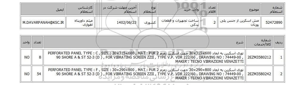 | 52472890 | مش اسکرین از جنس پلی یورتان | 2 | ساخت تجهیزات و قطعات یدکی | کشوری | 1402/06/23 | میثم داورپناه اهوازی | M.DAVARPANAH@KSC.IR |