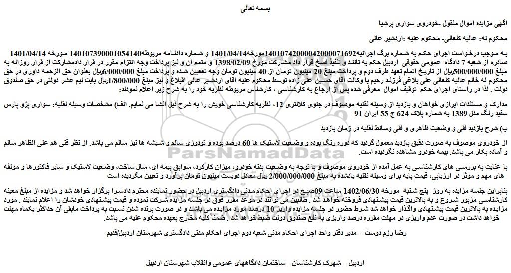 اگهی مزایده اموال منقول -خودروی سواری پرشیا