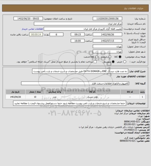 شرح کلی نیاز: ده عدد هارد دیسک EMC و DATA DOMAIN طبق مشخصات و شرح خدمات و پارت نامبر پیوست