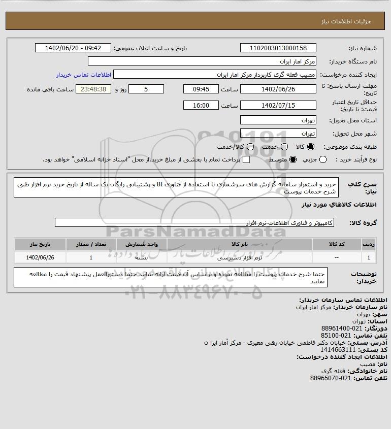 استعلام خرید و استقرار سامانه گزارش های سرشماری با استفاده از فناوری BI و پشتیبانی رایگان یک ساله از تاریخ خرید نرم افزار طبق شرح خدمات پیوست, استعلام خرید و استقرار سامانه گزارش های سرشماری با استفاده از فناوری BI و پشتیبانی رایگان یک ساله از تاریخ خرید نرم افزار طبق شرح خدمات پیوست