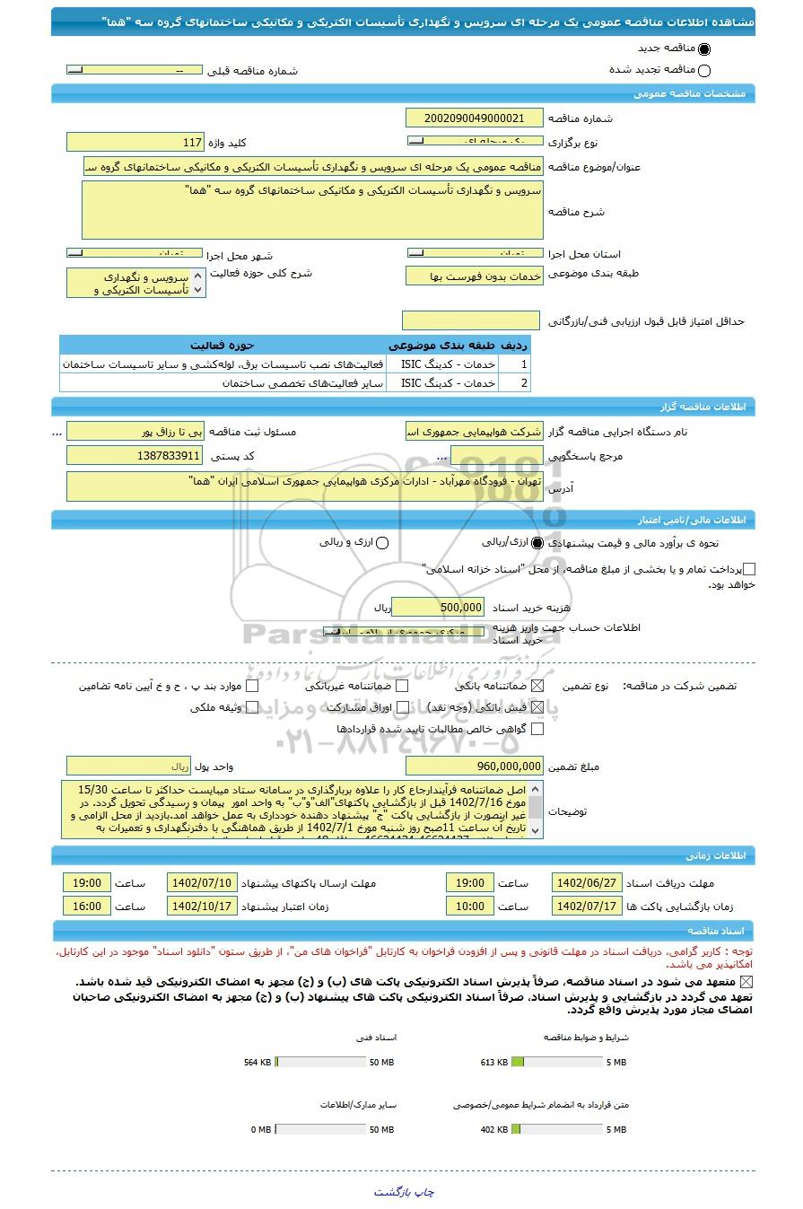 | عنوان/موضوع مناقصه | مناقصه عمومی یک مرحله ای سرویس و نگهداری تأسیسات الکتریکی و مکانیکی ساختمانهای گروه سه "هما" | |||||||||||