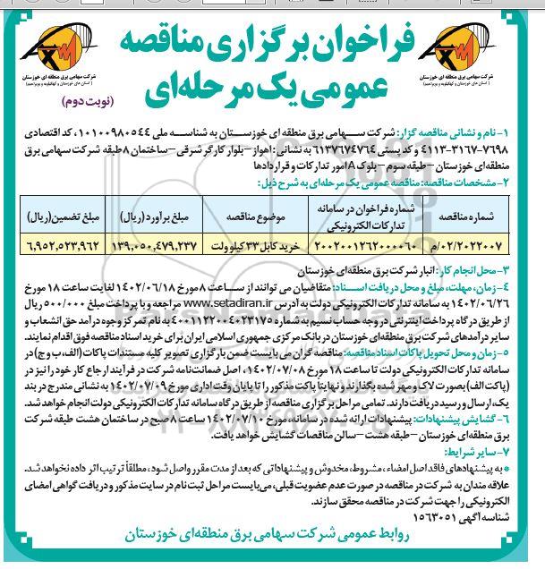 2022007/ 02 / م  2002001262000060 خرید کابل 33 کیلوولت 139.050.479.237 6.952.523.962