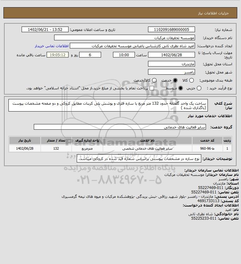 شرح کلی نیاز: ساخت یک واحد گلخانه حدود 132 متر مربع با سازه فلزی و پوشش پلی کربنات مطابق کروکی و دو صفحه مشخصات پیوست (باگذاری شده )