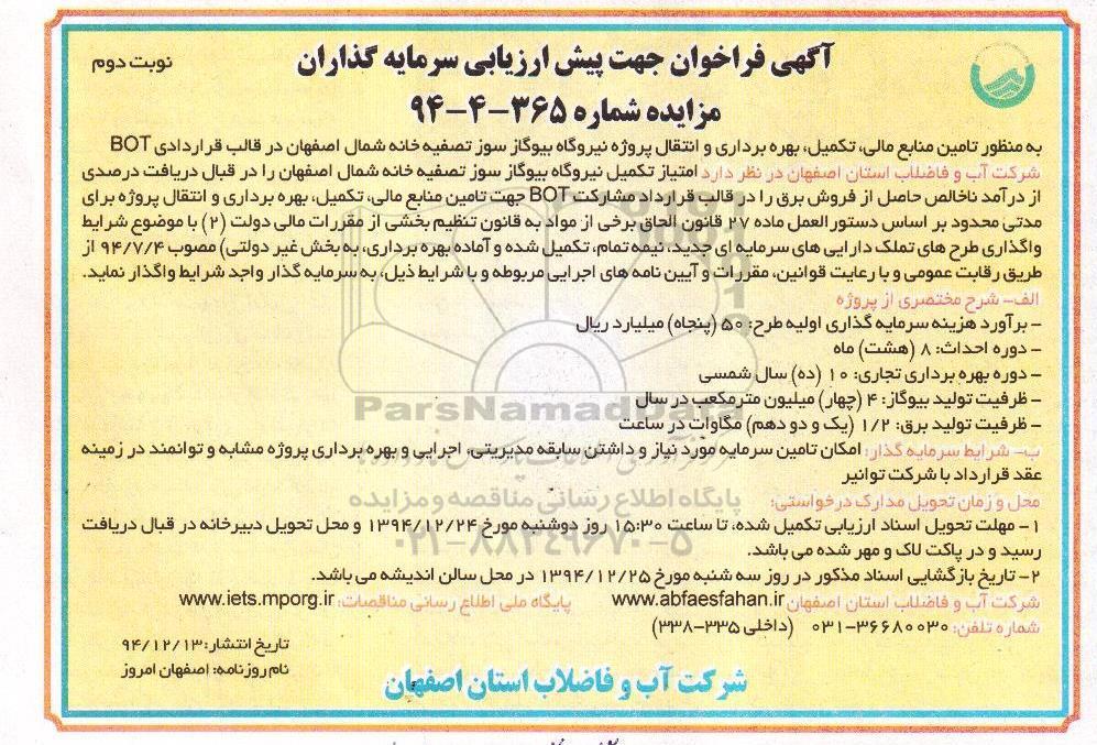 شرکت آب و فاضلاب استان اصفهان در نظر دارد امتیاز تکمیل نیروگاه بیوگاز سوز تصفیه خانه شمال اصفهان را در قبال دریافت درصدی از درآمد ناخالص حاصل از فروش برق را در قالب قرارداد مشارکت BOT جهت تامین منابع مالی , تکمیل , بهره برداری و انتقال پروژه برای مدتی محدود براساس دستورالعمل ماده 27 قانون الحاق برخی از مواد قانون تنظیم بخشی از مقررات مالی دولت 2 با موضوع شرایط واگذاری طرح های تملک دارایی های سرمایه ای جدید , نیمه تمام تکمیل شده و آماده بهره برداری به بخش غیر دولتی مصوب 94/7.4 از طرح رقابت عمومی و با رعایت قوانین , مقررات و آیین نامه های اجرایی مربوطه و با شرایط ذیل به سرمایه گذار واجد شرایط واگذار نماید